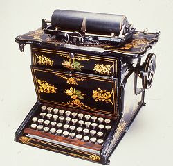 Remington Arms Company needed a new product to boost sales (rifles were moving more slowly). The company unveiled the first typewriter in 1874. It was heavy and loud and looked like a big metal sewing machine, as it was set on a table with a treadle at the bottom. The machine was cumbersome, the noise it made cacophonous. Worse, you had to write blind: the keys hit the underside of the paper. It did not sell. Businesses wouldn’t accept documents written on it because they were not penned. Remington sold only a few of that first model, but Mark Twain bought one. In his autobiography, he claimed to be the “first person in the world to apply the type-machine to literature” when he submitted a typed manuscript of